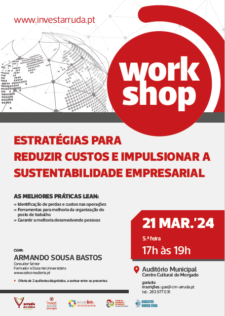 A Câmara Municipal de Arruda dos Vinhos, no âmbito do projeto Invest Arruda, vai realizar, no próximo dia 21 de março, um workshop cujo o tema será –”Estratégias para Reduzir Custos e Impulsionar a Sustentabilidade Empresarial”, que visa informar e apoiar, empresários, empreendedores e interessados no tema. Para mais esclarecimentos ou inscrição deve enviar e-mail para gae@cm-arruda.pt, com nome, nome de empresa se existir e contacto telefónico, ou ligar para telef. n.º263977031.